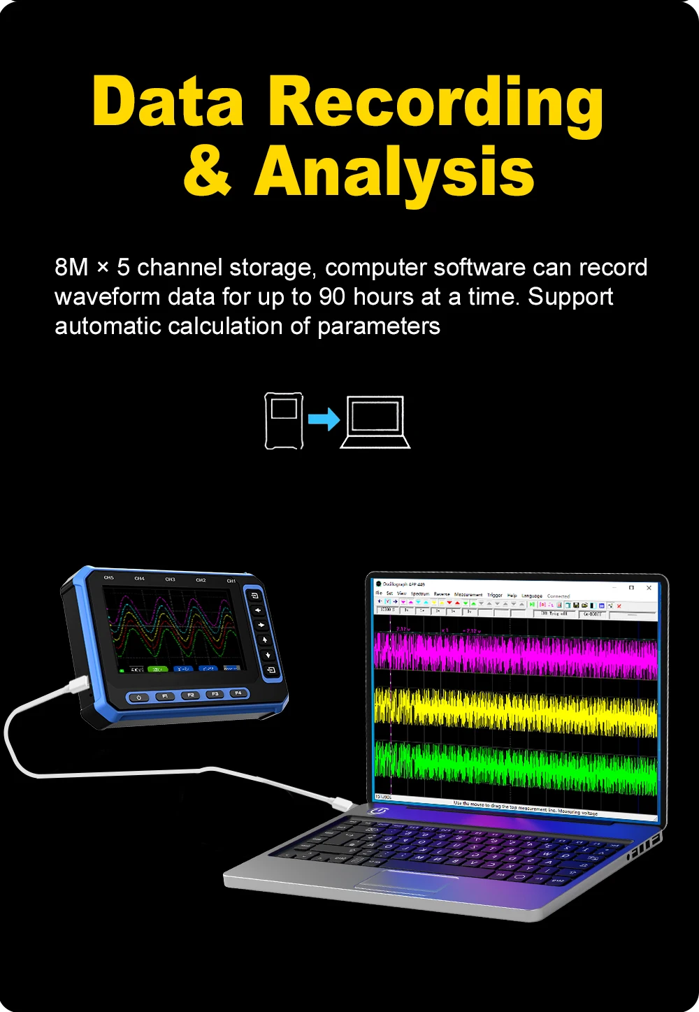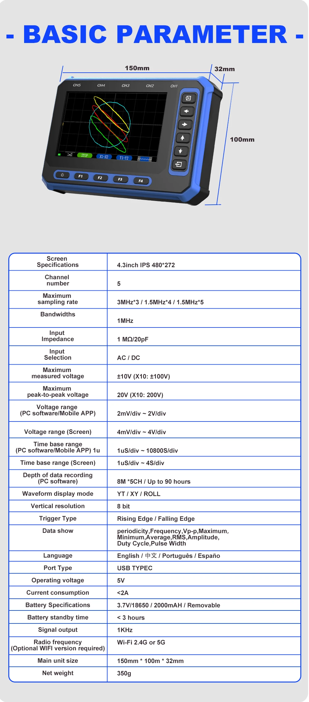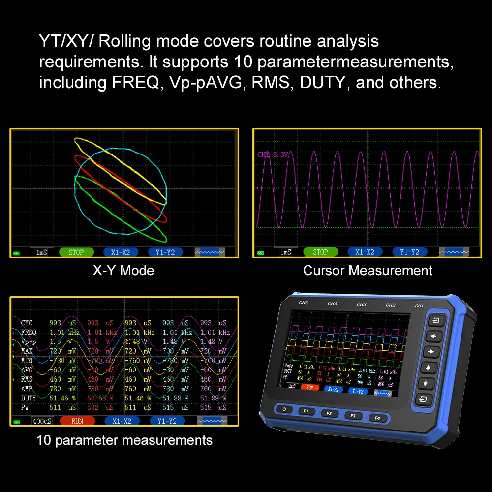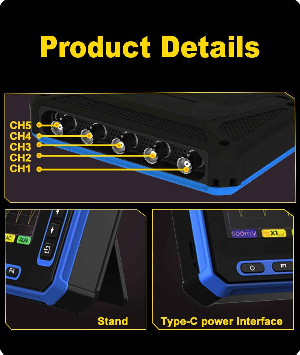 Excellent equipment, it handles very well, comes with horizontal and vertical cursors, the trigger is very precise… 5 channels, can connect to Windows laptop or Android smartphone wirelessly or with USB, the battery lasts quite a bit… and for charging, it charges quickly… the screen is very large…