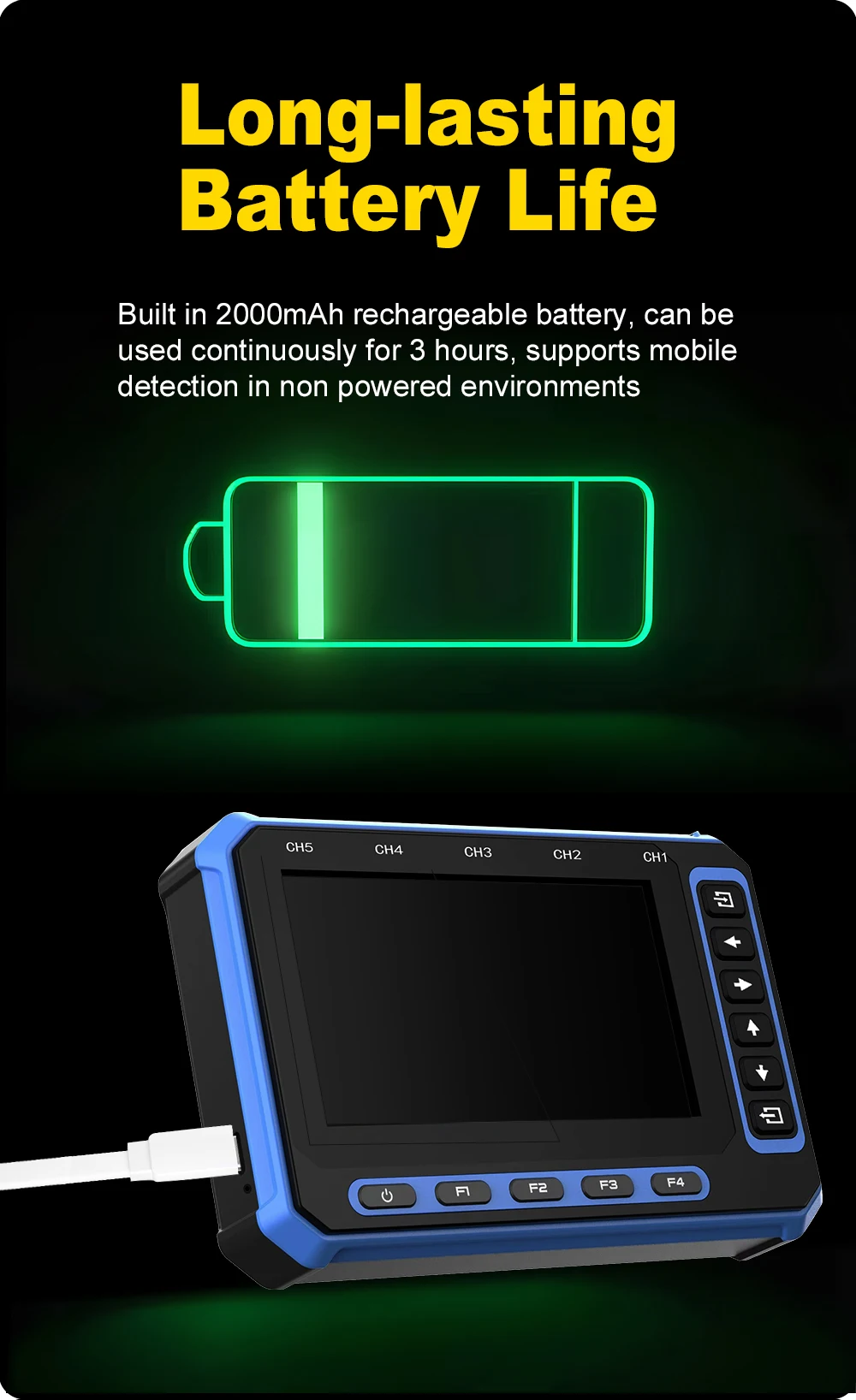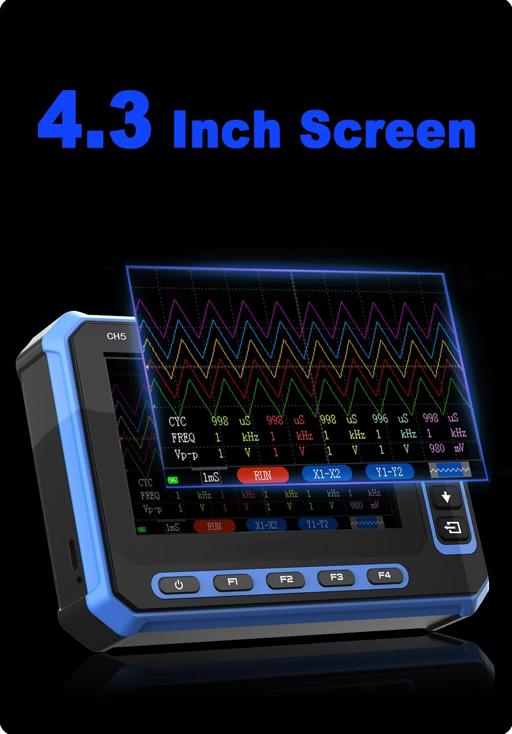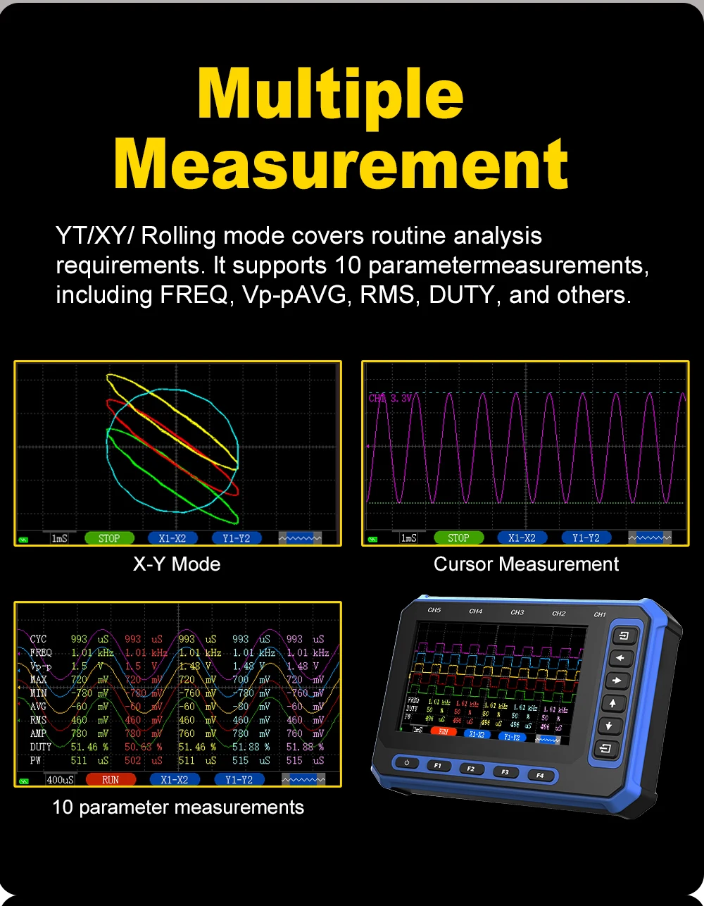 Excellent equipment, it handles very well, comes with horizontal and vertical cursors, the trigger is very precise… 5 channels, can connect to Windows laptop or Android smartphone wirelessly or with USB, the battery lasts quite a bit… and for charging, it charges quickly… the screen is very large…